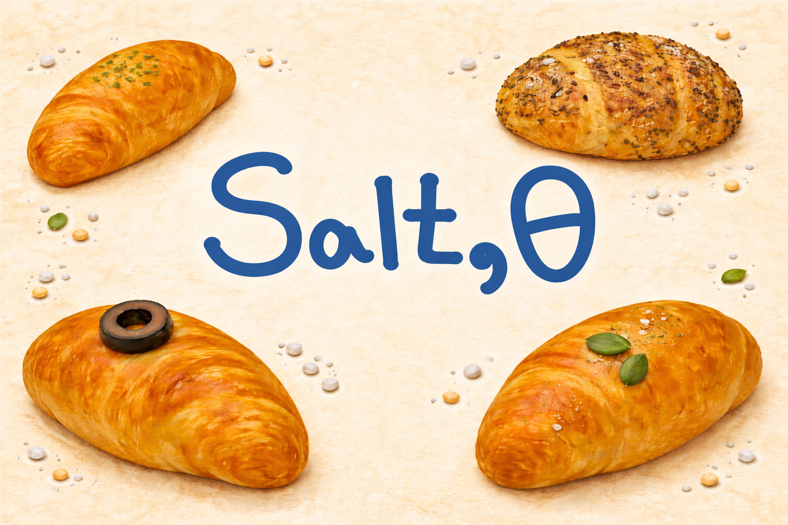 양파, 치아시드, 참깨, 검은깨 등이 토핑된 고소하면서도 담백하게 즐길 수 있는 소금빵